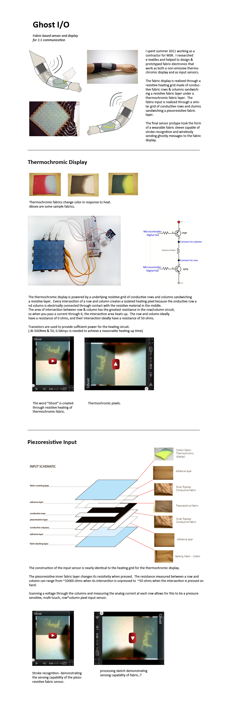 I spent summer 2011, working as a contractor at Microsoft Research. I researched e-textiles and helped to design & prototyped fabric electronics that work as both a non-emissive thermochromic display and as input sensors.
