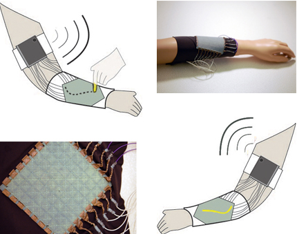 The fabric input is realized through a similar grid of conductive rows and columns sandwiching a piezoresistive fabric layer.